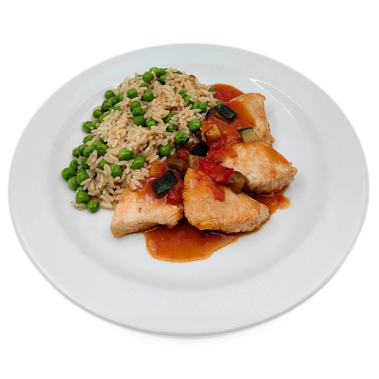 Turkey medallions in a sauce made with tomatoes, eggplants, zucchini, olives, capers, onions, and spices.