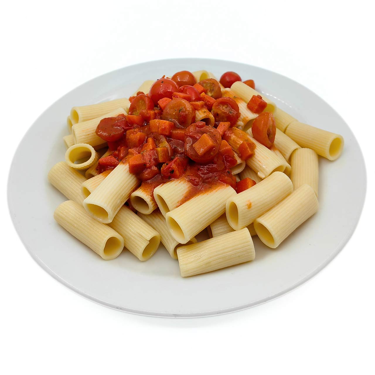 A meatless dish with short tube-shaped pasta in a sauce made with roasted cherry tomatoes and spices.