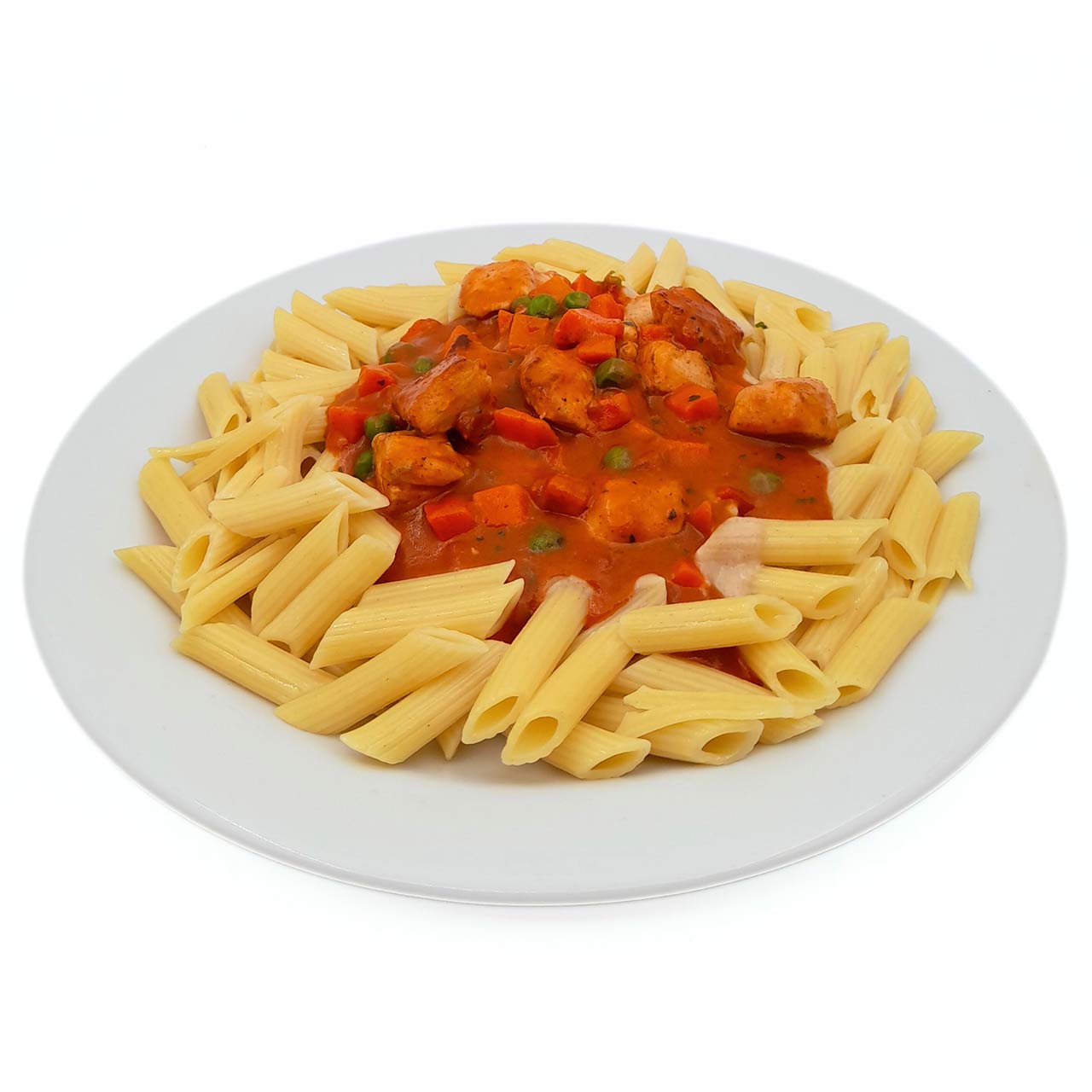 Pasta in the shape of tubes with pieces of chicken meat in a tomato sauce with carrots and peas.