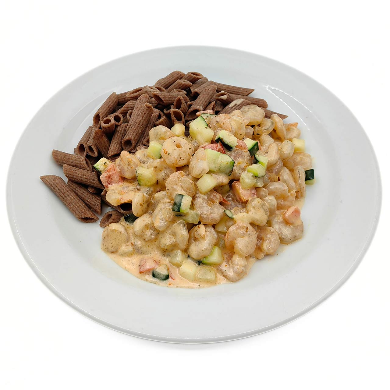 Whole wheat pasta in a creamy sauce with shrimp and vegetables.