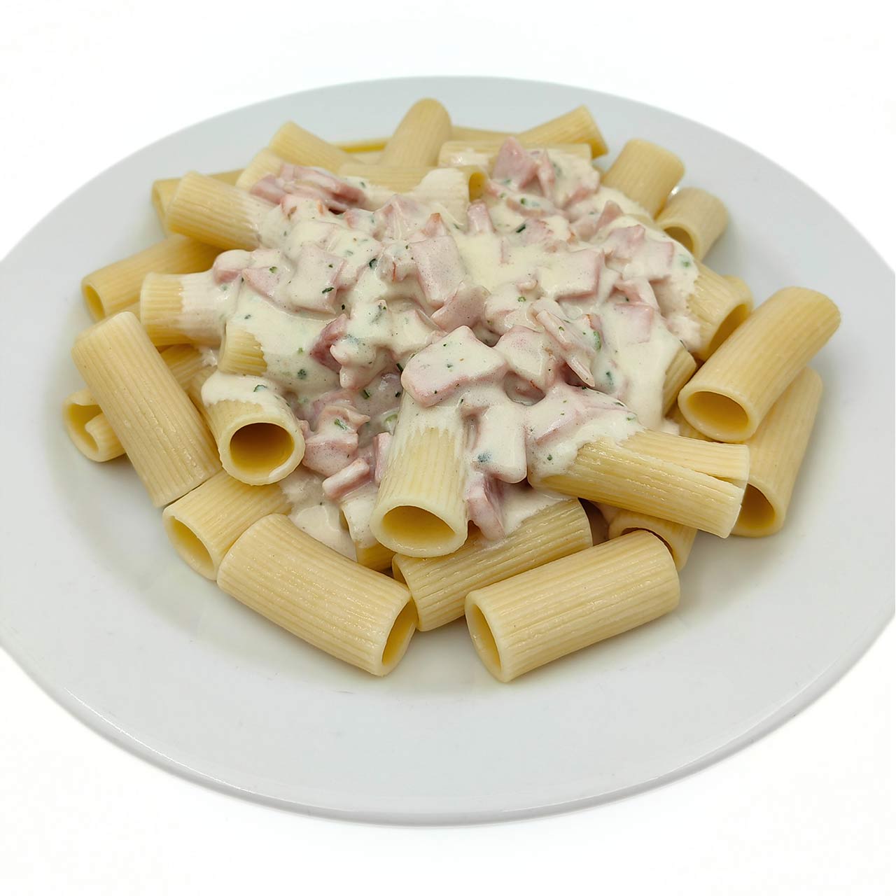 Short tube - shaped pasta in a popular Italian sauce made with crispy bacon, egg yolks, and cream.