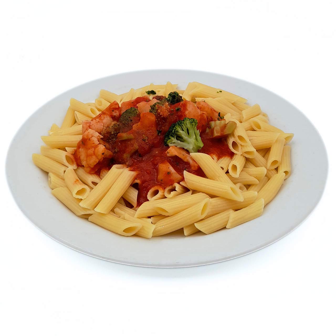Pasta in the shape of tubes in a tomato sauce with vegetables.
