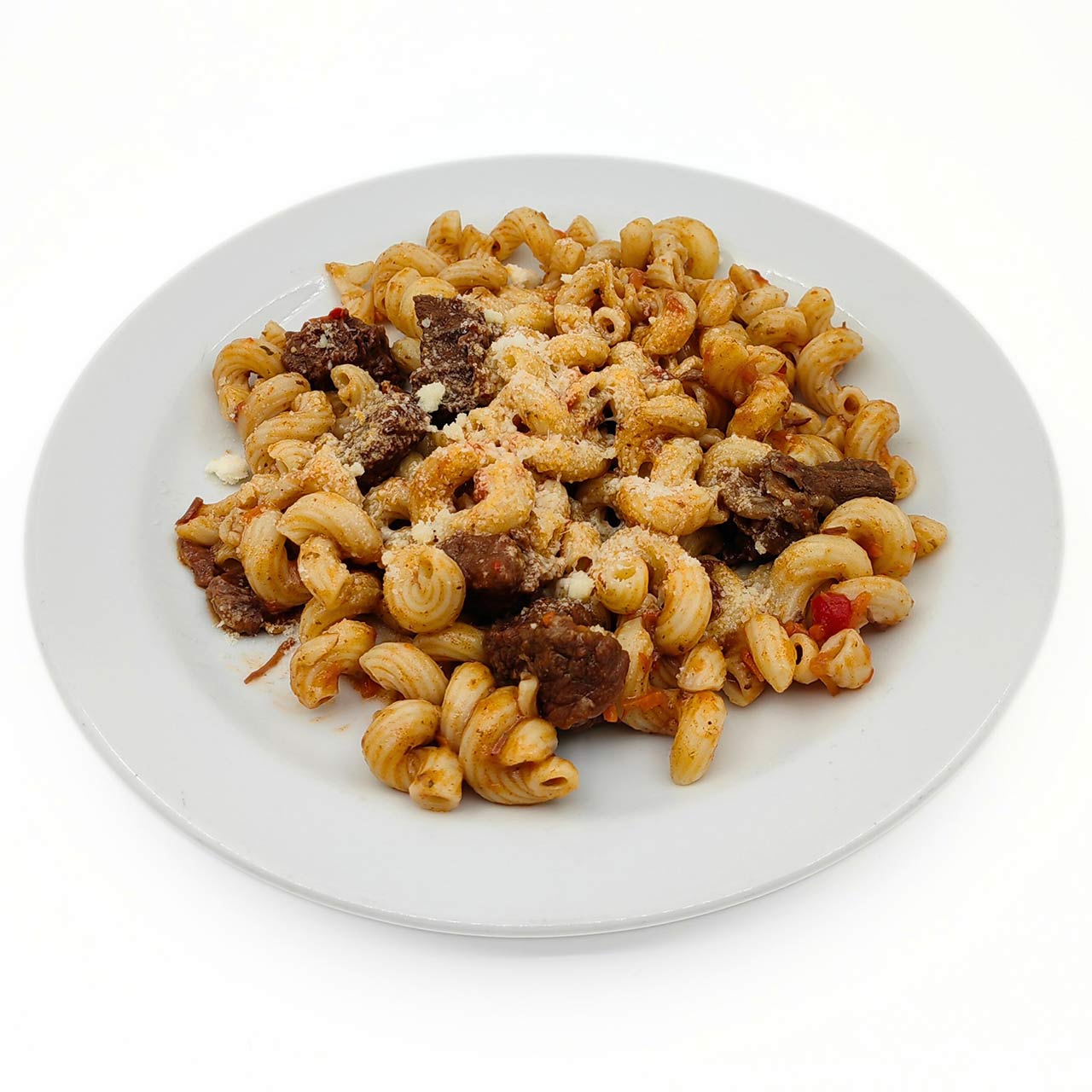 Tube-shaped pasta with pieces of beef in a tomato sauce.