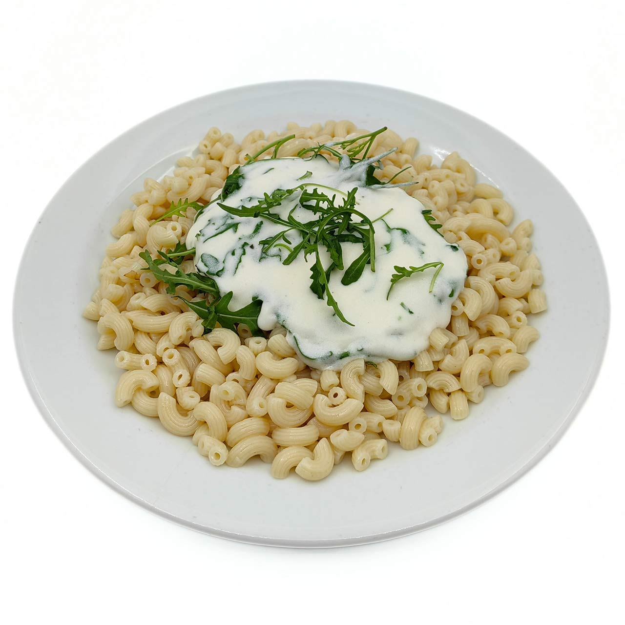Pasta in the shape of snails with a sauce made of cream, cheese, and a hint of rucola.